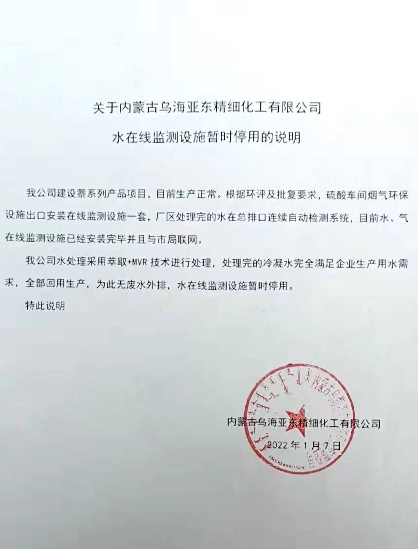 關(guān)于內(nèi)蒙古烏海亞東精細化工有限公司水在線監(jiān)測設施暫時停用的說明